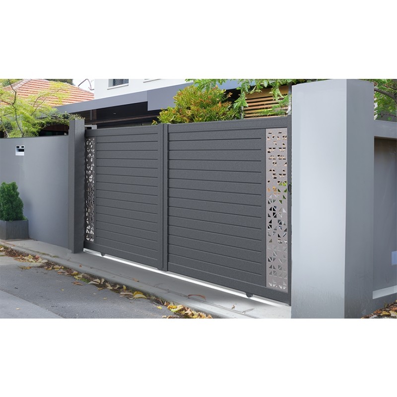 Portail avec remplissage tôle décorative. Remplissage par lames trapézoïdes avec ajours 105*20 mm (raidisseur sur vantail > 2000 mm). Forme droite uniquement